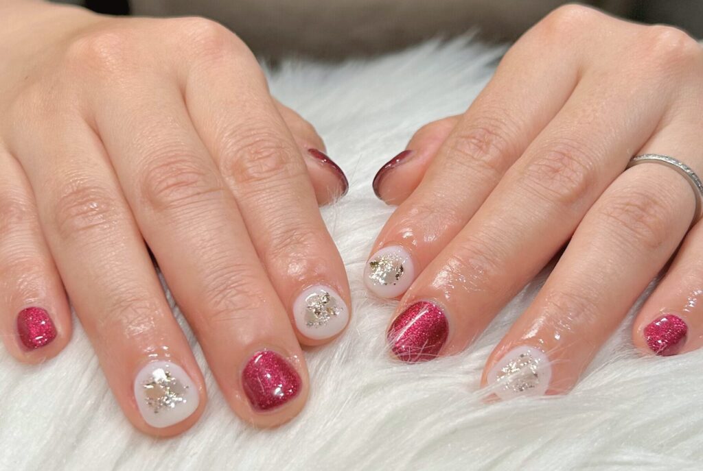 冬の定番ボルドーカラーと乳白色でクリスマスネイルにぴったりです!