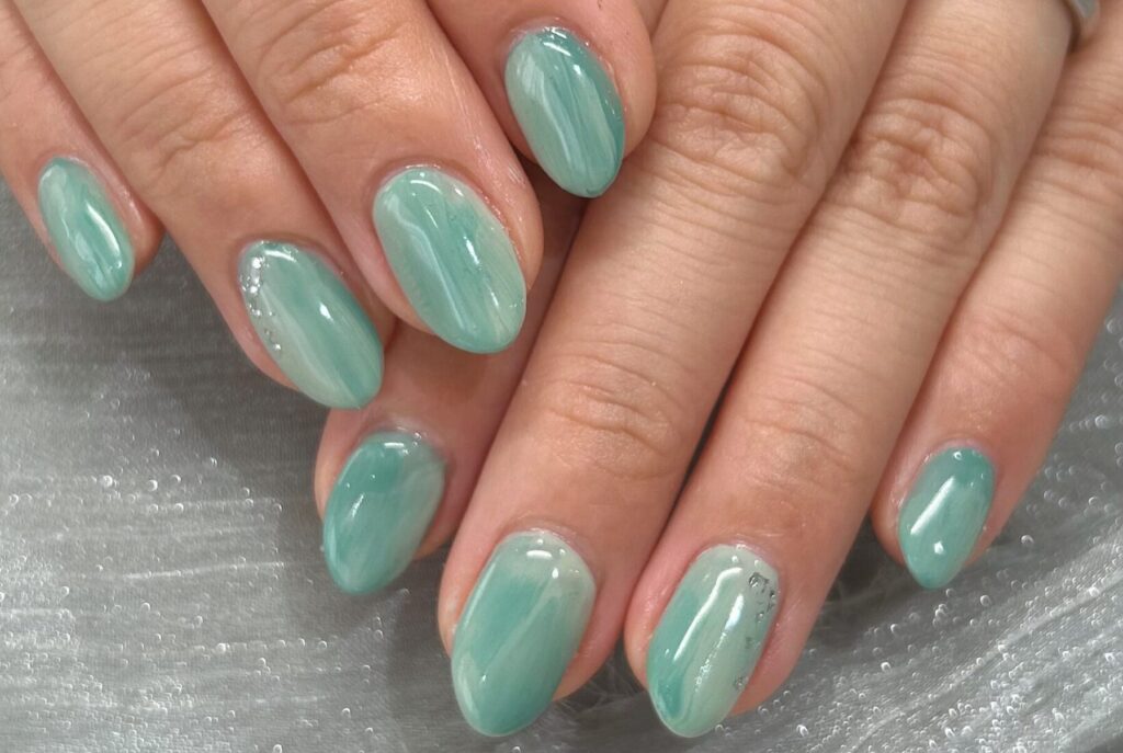 コサージュに合わせた淡いグリーンネイルで華やかに☆