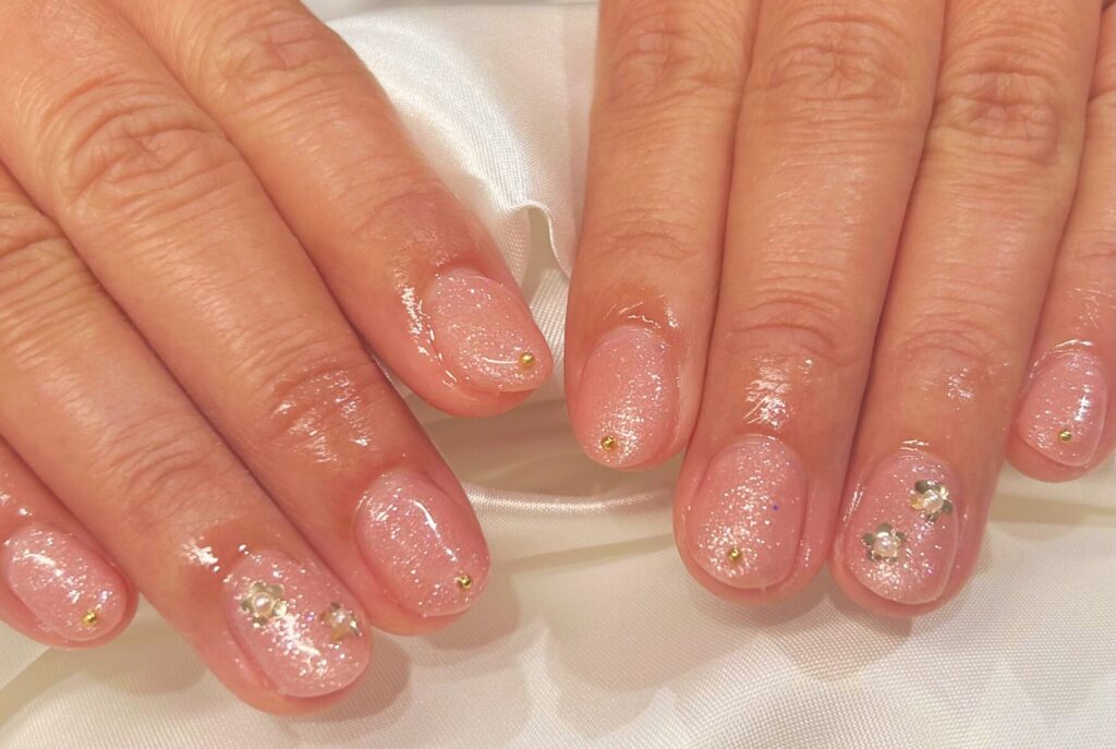 ピンクのラメネイルにフラワー&スタッズで春仕様のネイルになります!